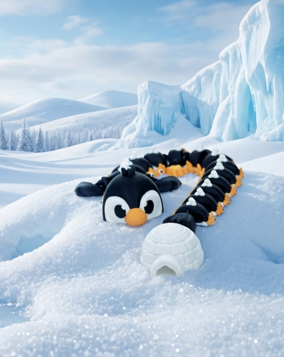 Waddle into a world of frosty fantasy with the Articulated Penguin Dragon! This delightful 3D-printed hybrid combines the tuxedoed charm of an Antarctic penguin with the sleek, multi-segmented body of a mythical dragon.